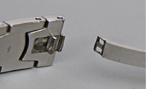 破損したクラスプのロー付け 依頼内容:破損してしまったクラスプ部分の修理 作業内容:破損部分が変形・紛失していないものであれば、ロー付け(接着)にて取付ることが可能です。 *画像のようにローをつけて接着いたします。